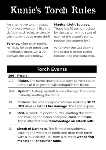 Instead of every torch lasting a fixed amount of real-time minutes, the GM now rolls 1d20 each round for every torchbearer. Only on a natural 20 do you check the 2d6 Torch Events table, where half the results cause the flame to flicker and maybe go out next round, while the remaining outcomes instantly snuff the light with some consequence.